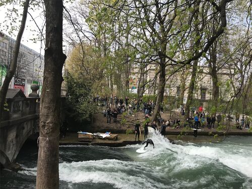 常に安定して波があり、サーフィンを楽しむことができる場所、それがアイスバッハ・ヴェレ(Eisbachwelle) 観客も沢山いるのでサーファーも腕の見せ所ありといったところ サーファーは1人ずつ左右交互に波に乗っていく 1分もしないうちにどんどん交代してい…